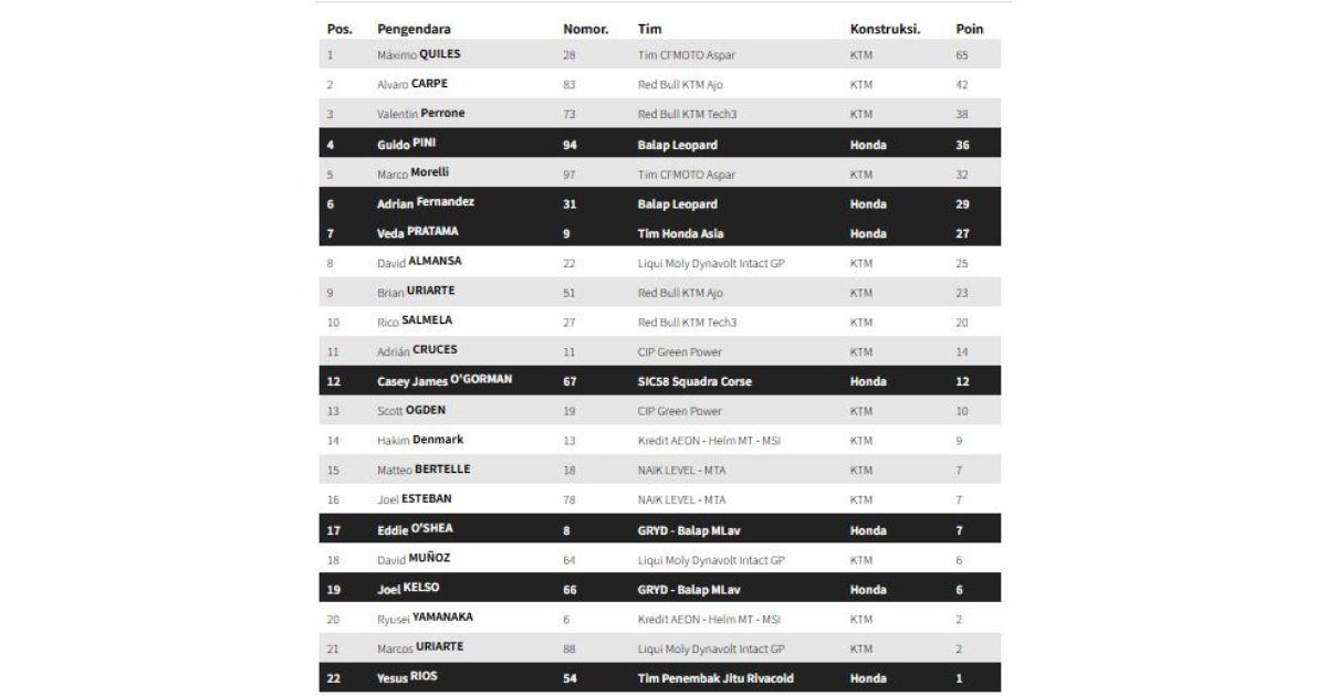 Berdasarkan hasil klasemen akhir Moto3 MotoGP Amerika Serikat 2026, Maximo Quiles masih memimpin dengan raihan 65 poin.
