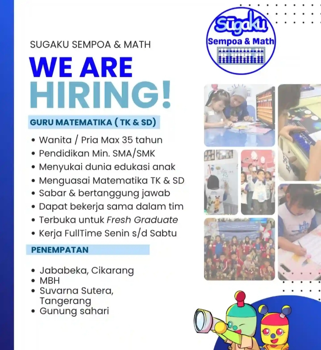 Sugaku Sempoa & Math Buka Lowongan Guru Matematika TK dan SD, Terbuka untuk Fresh Graduate!