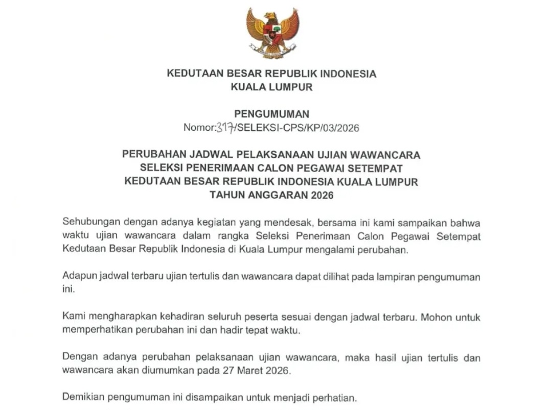 KBRI Kuala Lumpur Umumkan Jadwal Tes Wawancara Calon Pegawai Setempat 2026, Ini Jadwal Lengkapnya